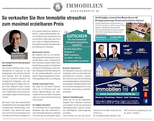 Lesen Sie unseren aktuellen Artikel zum Thema „Immobilien“ in der Landsberger Monatszeitung: So verkaufen Sie Ihre Immobilie stressfrei zum maximal erzielbaren Preis ???Viele weite Informationen zum Immobilienverkauf finden Sie auch auf unserer Website. Dazu einfach auf den Button „weitere Informationen“ klicken und Sie werden weitergeleitet. Ihr professioneller Immobilienmakler im Großraum Landsberg am Lech, Augsburg, München, Ammersee und Starnbergersee ??