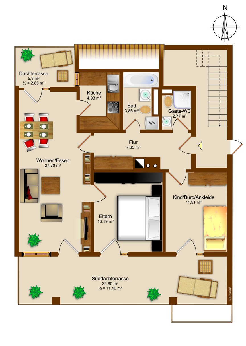 - 3-Zimmer-Dachterrassenwohnung im Dachgeschoss mit zwei Dachterrassen