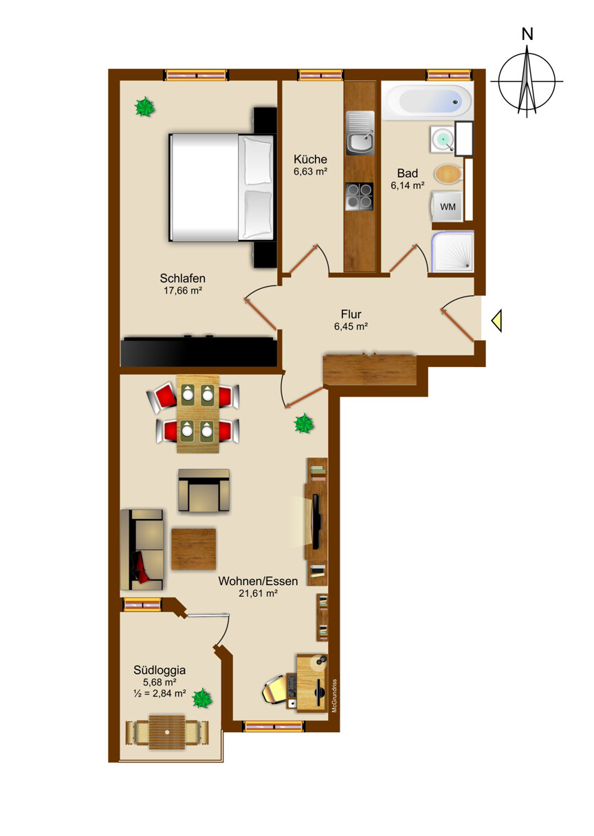 Die Wohnungen überzeugen durch helle, lichtdurchflutete Räume, hochwertige Laminatböden und eine durchdachte Raumaufteilung. Jede Einheit verfügt über einen Balkon, eine Loggia oder, im Fall der Dachgeschosswohnung, über zwei Dachterrassen, die dank optimaler Südausrichtung sonnige Wohnbereiche schaffen. Zwei der Wohnungen sind mit Einbauküchen ausgestattet, die Küchen der anderen Wohnungen gehören den Mietern. Jede Wohnung verfügt über ein eigenes Kellerabteil (ca. 5 m² Nutzfläche, die Dachterrassenwohnung über ein besonders großes mit ca. 10 m² Nutzfläche). Das helle und freundliche Treppenhaus mit großer Verglasung sorgt für einen maximalen Lichteinfall und lässt keine Wünsche offen. Ein Hausmeisterbetrieb kümmert sich um die Pflege des Gebäudes, die Wartung der technischen Anlagen sowie um Sauberkeit und Ordnung in den gemeinschaftlich genutzten Bereichen, sodass ein stets gepflegtes und einladendes Wohnumfeld gewährleistet ist.