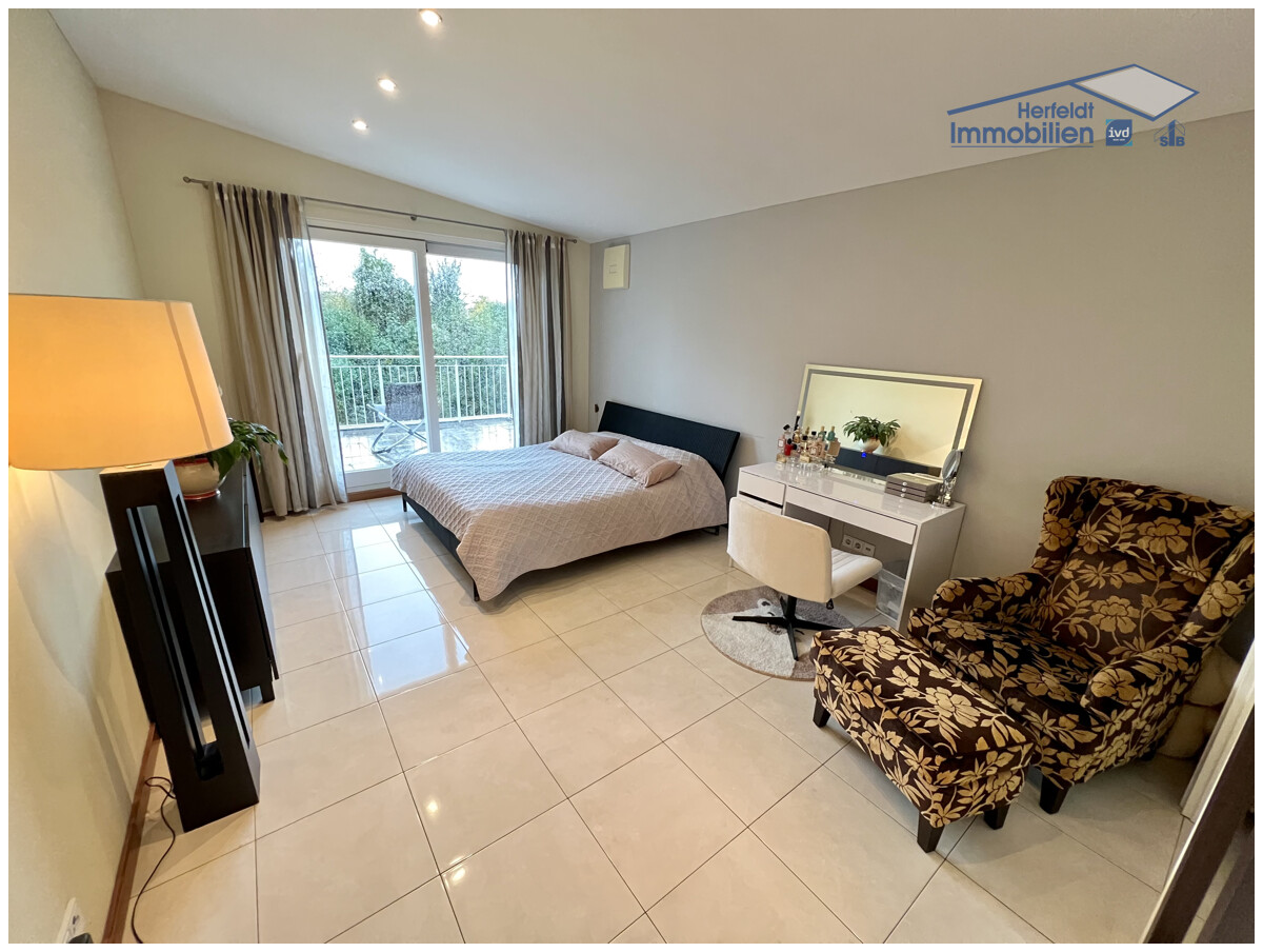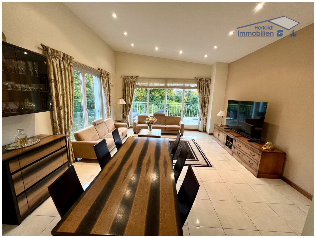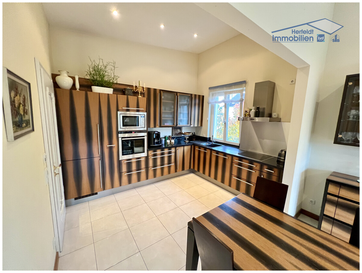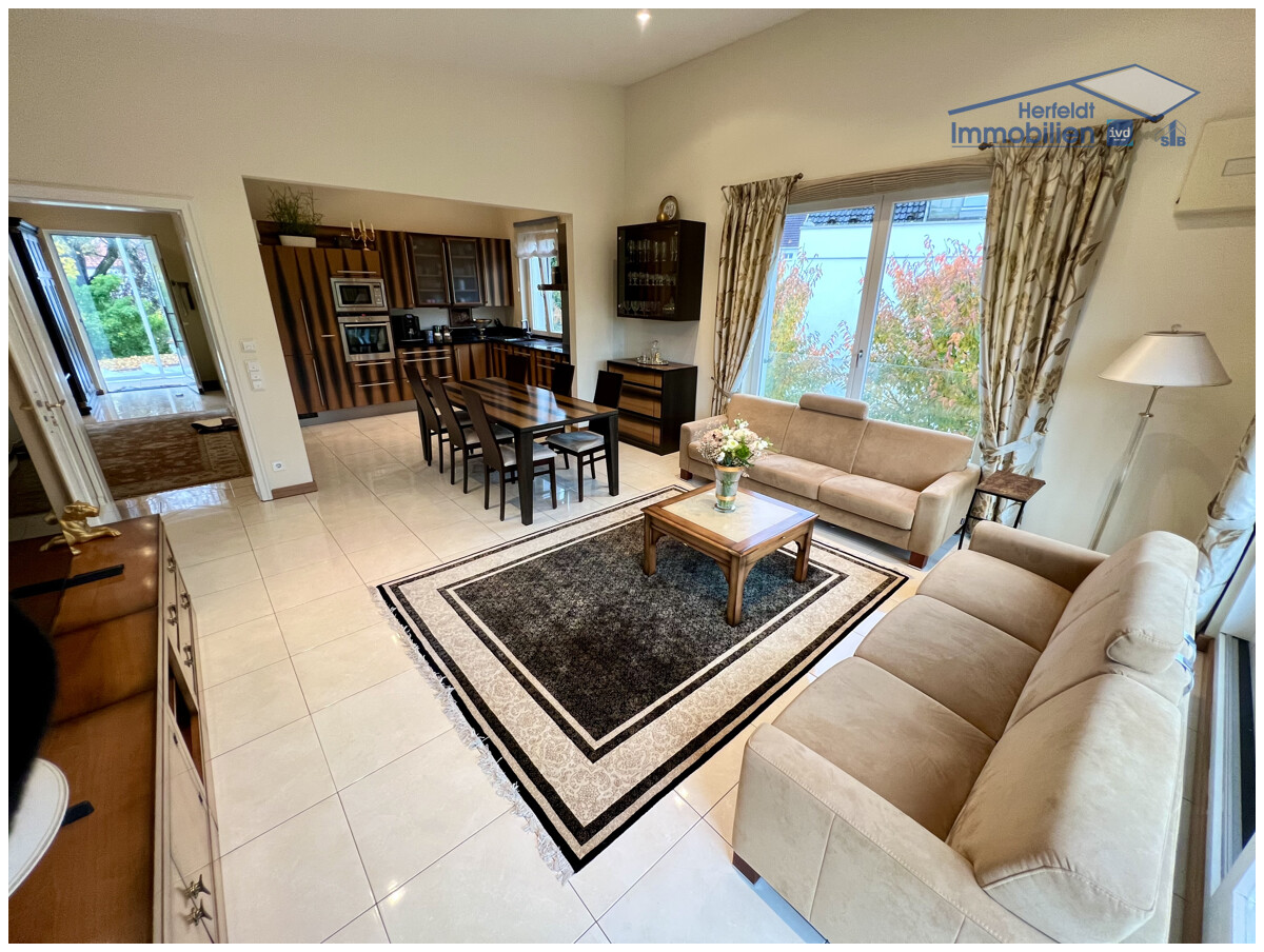 Bereits beim Betreten eröffnet sich ein außergewöhnlich heller Wohn- und Essbereich, geprägt von weitläufigen Glasflächen und einem stimmig durchdachten Grundriss. Die natürliche Belichtung schafft ganztägig eine besondere Wohnatmosphäre, die sowohl offen als auch behaglich wirkt. Die hochwertige Einbauküche im Wert von ca. 15.000 € integriert sich harmonisch und macht den zentralen Wohnbereich zu einem repräsentativen Mittelpunkt für Genuss, Geselligkeit und stilvolles Wohnen.