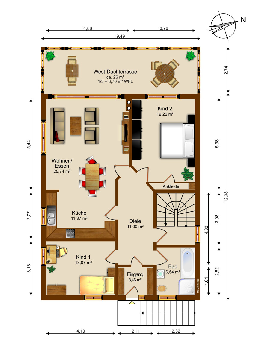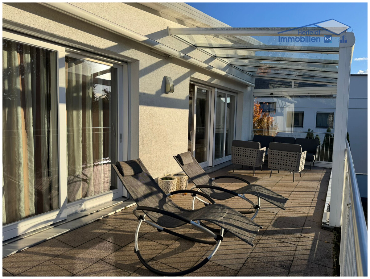Die imposante, halb überdachte Dachterrasse ist ohne Zweifel eines der Highlights dieser Wohnung. Mit großzügigen Flächen, herrlicher Abendsonne und einem weitläufigen Blick ins Grüne bietet sie ein Ambiente, das Entspannung, Eleganz und Outdoor-Living auf unvergleichlichem Niveau vereint – perfekt für Lounge-Möbel, Pflanzenarrangements oder gesellige Abende unter freiem Himmel.