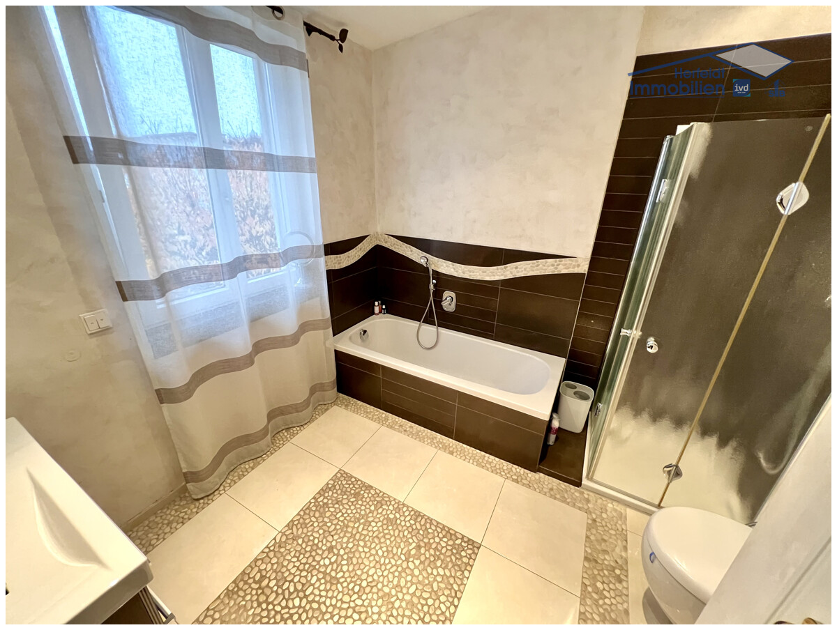 Zwei ruhige, gut geschnittene Schlafzimmer bieten ideale Rückzugsmöglichkeiten für Paare, Einzelpersonen oder Homeoffice-Nutzer. Das luxuriöse Tageslichtbad mit Walk-in-Dusche, Regenduschkopf, Naturstein-Mosaikfliesen und hochwertigen Armaturen spiegelt den durchgehend gehobenen Wohnstandard eindrucksvoll wider.