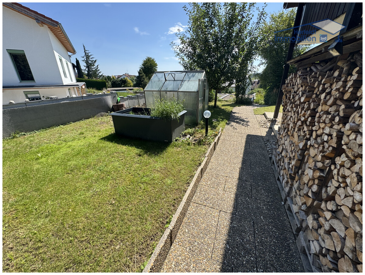Der Südgarten präsentiert sich großzügig und liebevoll angelegt. Drei Apfelbäume, ein Mirabellen- und ein Haselnussbaum, Brombeersträucher sowie ein kleines Gewächshaus schaffen eine grüne Oase mit hohem Freizeitwert. Ein Geräteschuppen und ein separater Holzlagerbereich sorgen für Ordnung und Funktionalität.