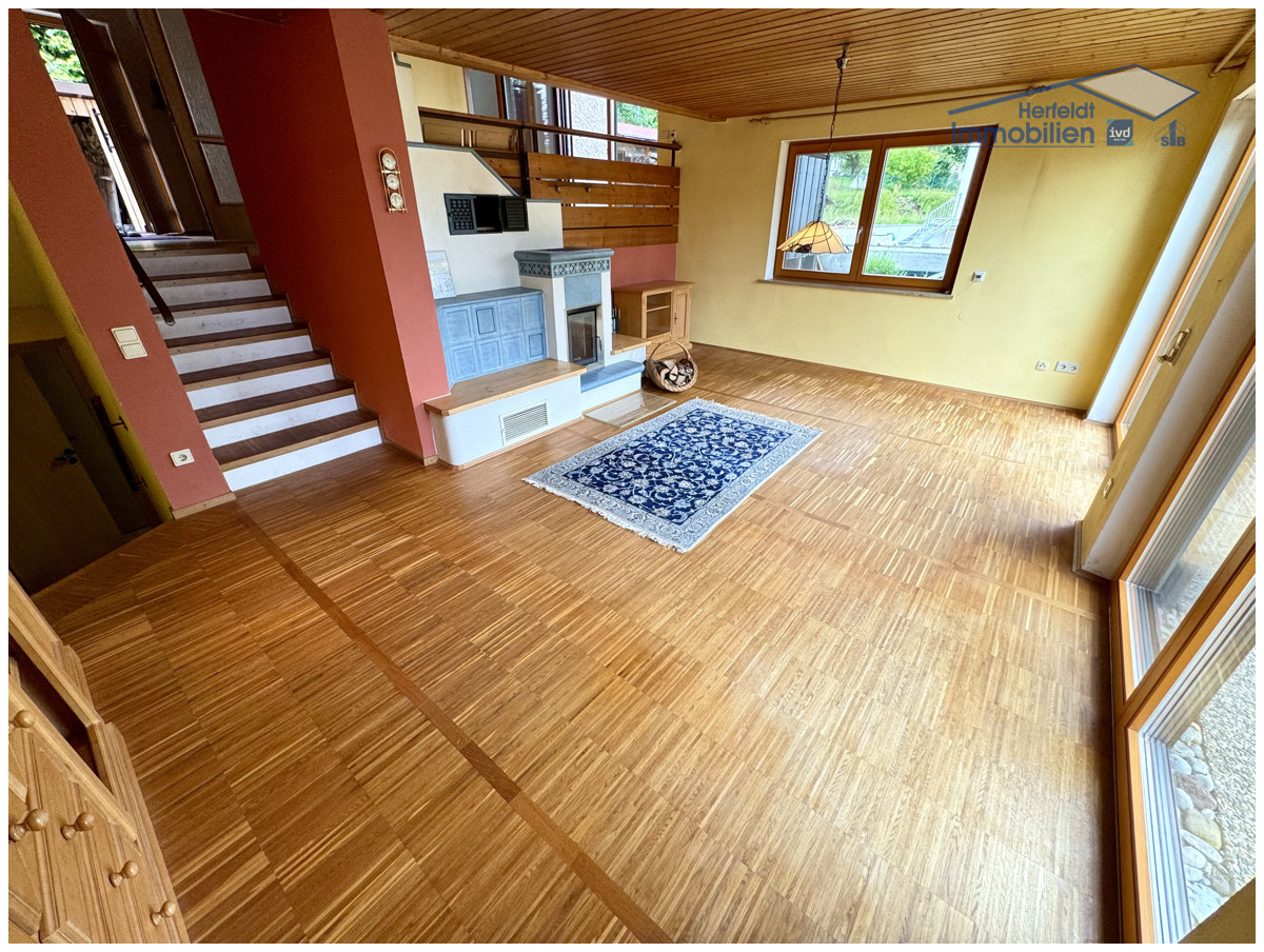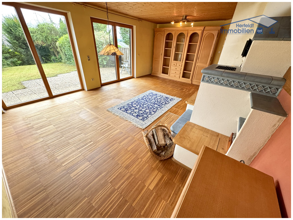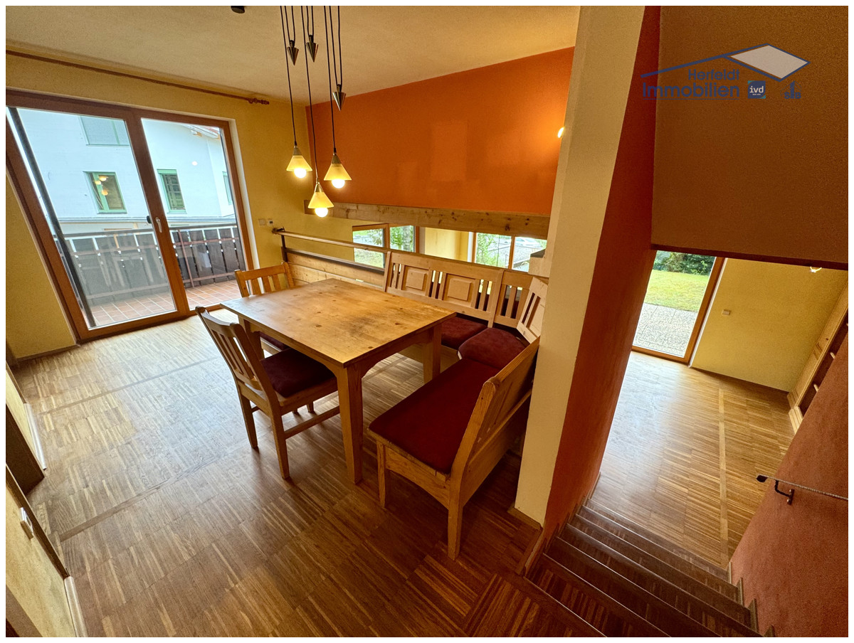 Das Entrée empfängt mit einem Windfang samt Garderobenbereich und einem Gäste-WC, bevor es in den einladenden Essbereich mit Zugang zum Balkon übergeht. Von hier aus fügen sich Küche und Arbeitszimmer harmonisch in das durchdachte Wohnkonzept ein. Nur wenige Stufen tiefer entfaltet sich der lichtdurchflutete Wohnbereich mit bodentiefen Fenstern, Terrasse und Garten mit Südausrichtung – ein Ort der Ruhe, mit gemütlichem Flair durch einen sehr schönen Kachelofen, der Behaglichkeit und Charakter verleiht.