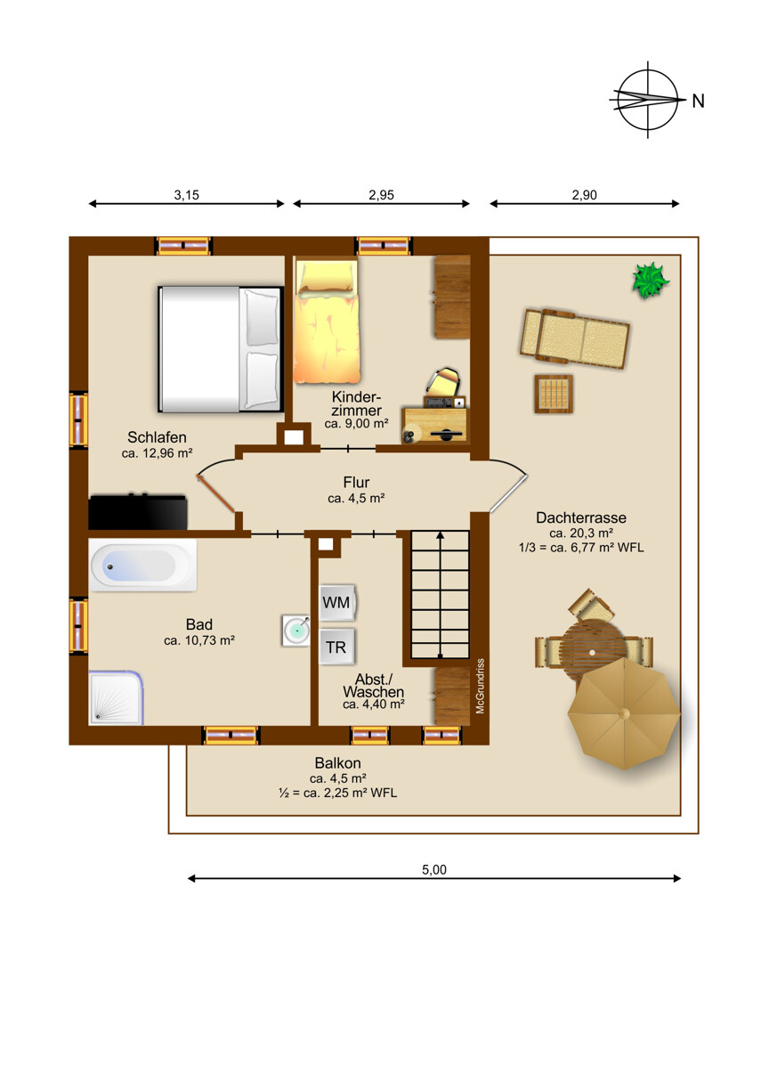 Vom Obergeschoss aus betreten Sie die herrliche Dachterrasse mit ca. 20 m² und Markise (ablösbar), die zusammen mit dem überdachten Balkon mit ca. 4,5 m² wunderbare Möglichkeiten zum Entspannen, Grillen oder Sonnen bietet – ein echtes Highlight des Hauses. Über eine Ausziehtreppe im Flur des Obergeschosses erreichen Sie das ca. 45 m² große Dachgeschoss, das aktuell als Lager dient, jedoch aufgrund seiner Struktur ideal für eine spätere Erweiterung vorbereitet werden könnte.