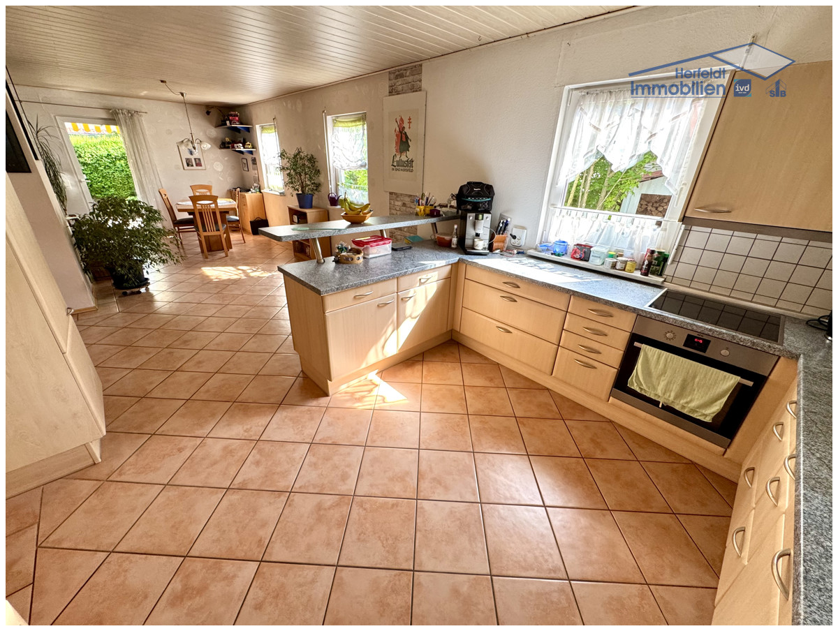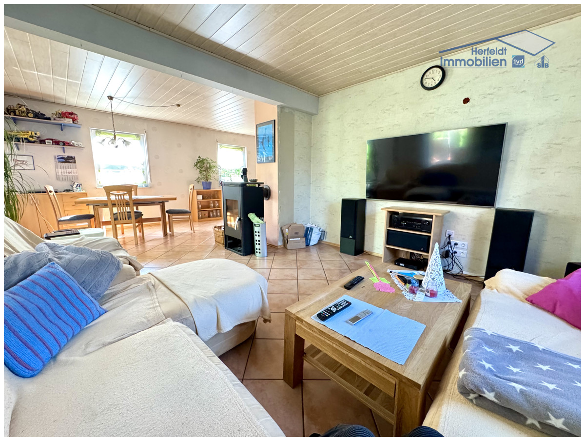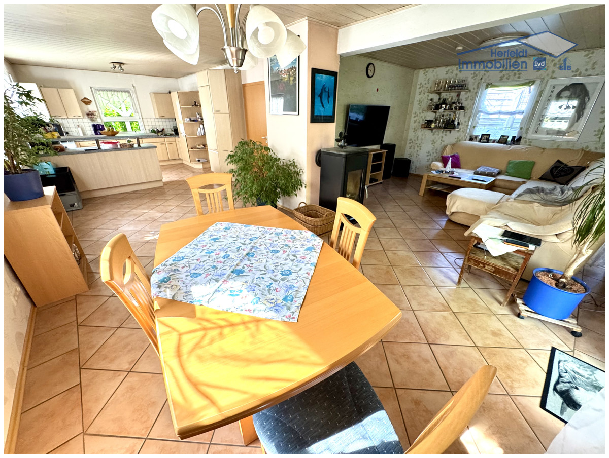 Der offene Wohn-, Ess- und Kochbereich erstreckt sich über ca. 50 m² und überzeugt mit einer hellen und freundlichen Atmosphäre. Ein Schwedenofen sorgt für wohlige Wärme, während große Fenster viel Tageslicht hereinlassen. Zur Einrichtung des Hauses gehört eine hochwertige Einbauküche mit, abgesehen vom Kühlschrank, neuwertigen Elektrogeräten, welche im Preis inbegriffen ist. Eine praktische Speisekammer bietet zusätzlichen Stauraum. Die überdachte Südwestterrasse mit ca. 20 m² und Markise schafft eine einladende Atmosphäre, um entspannte Stunden im Freien zu verbringen. Ein modernes Badezimmer mit Dusche rundet das Erdgeschoss ab.