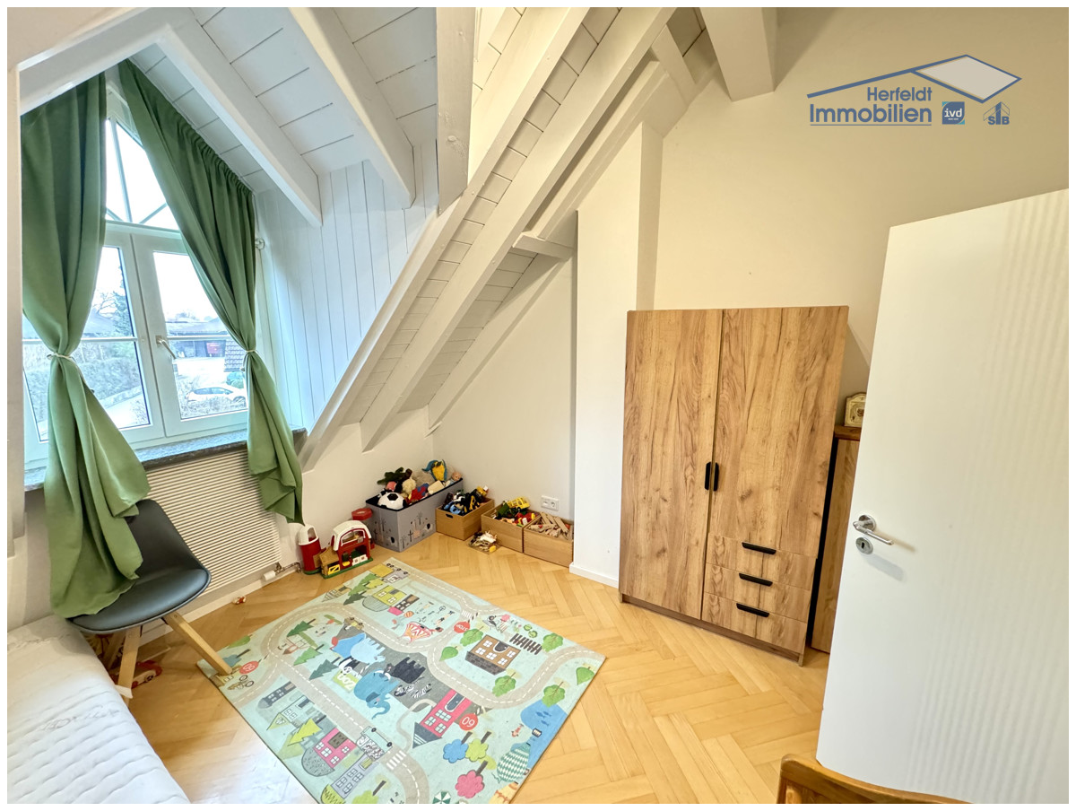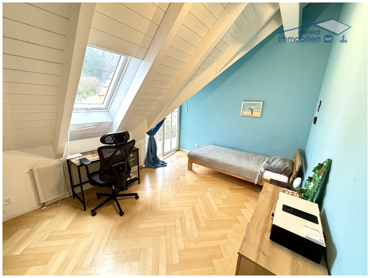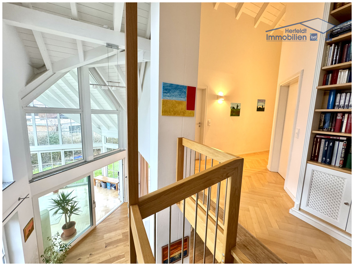 Die Innenausstattung überzeugt durch hochwertige Materialien: Der Eingangsbereich ist mit Granit gestaltet, während in den übrigen Wohnräumen edles Eichen-Echtholzparkett verlegt wurde, das 2021 erneuert wurde. Auch die Treppe wurde 2021 in Eiche modernisiert. Im Dachgeschoss beeindruckt das Fischgrät-Parkett, die hohen Decken und die offene Galerie verleihen dem Raum ein einzigartiges Flair. Ein stilvoller Balkon ergänzt diesen Bereich perfekt.