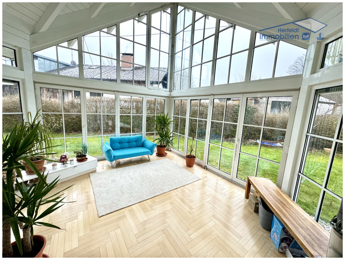 Das großzügige Grundstück von ca. 776 m² überzeugt durch eine harmonische Gestaltung und ausreichend Platz für Entspannung, Spiel und gesellige Stunden. Ein weiteres Highlight ist der lichtdurchflutete Wintergarten, der zu jeder Jahreszeit zum Verweilen einlädt und ein besonderes Wohlfühlambiente bietet.