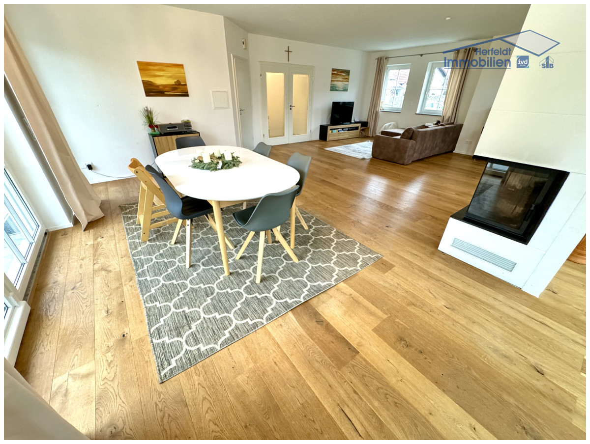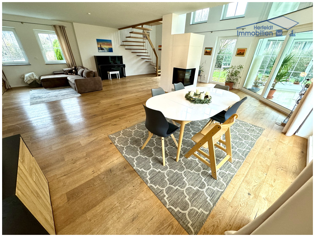 Der stilvolle, beheizbare Wintergarten aus Stahlkonstruktion mit elektrischer Außenbeschattung lädt zu gemütlichen Stunden ein und schafft eine harmonische Verbindung zum großzügigen Gartenbereich mit Westterrasse. Ein Kaminofen der Marke Hark im Wohn-Ess-Bereich mit über 60 m² verleiht dem Raum eine edle und behagliche Atmosphäre.