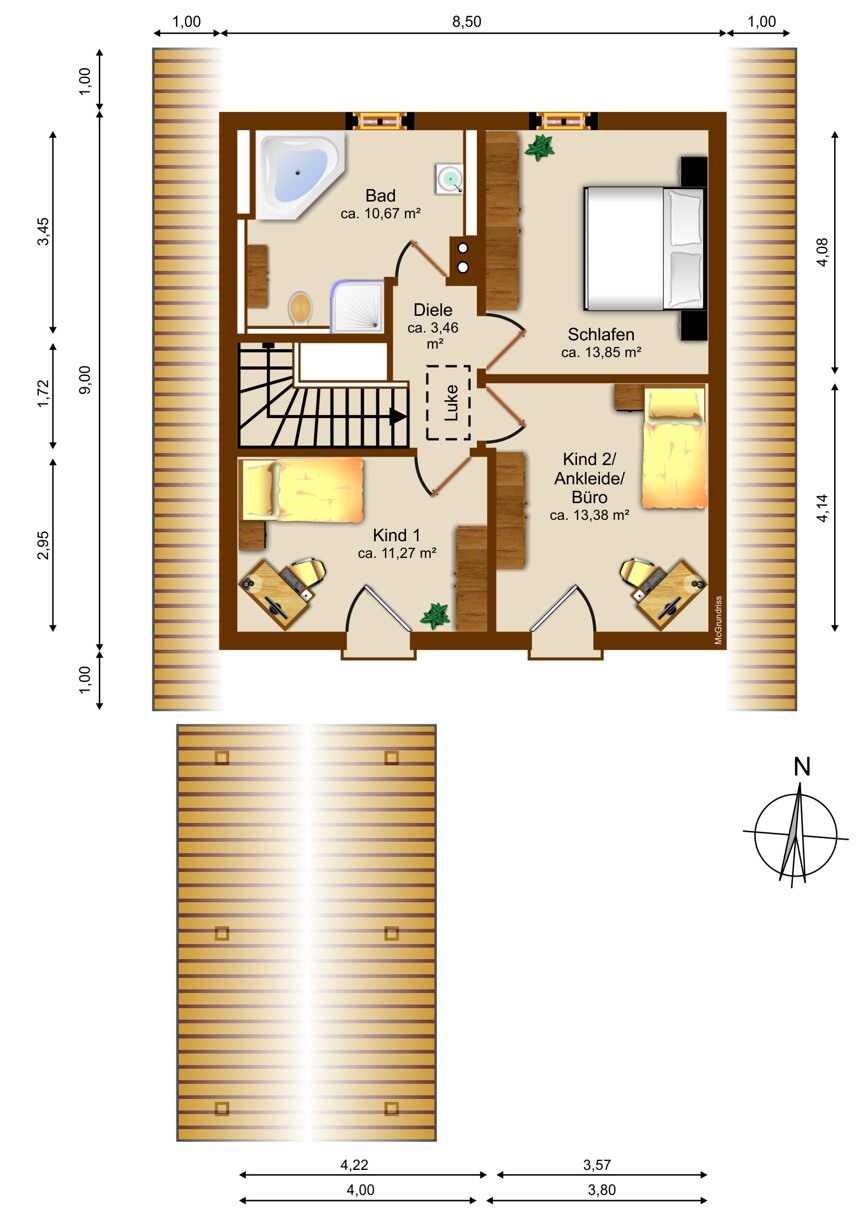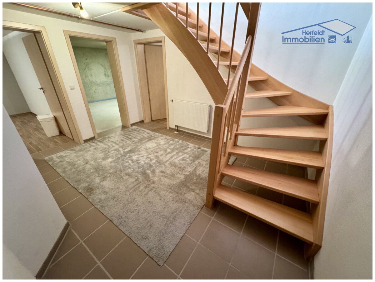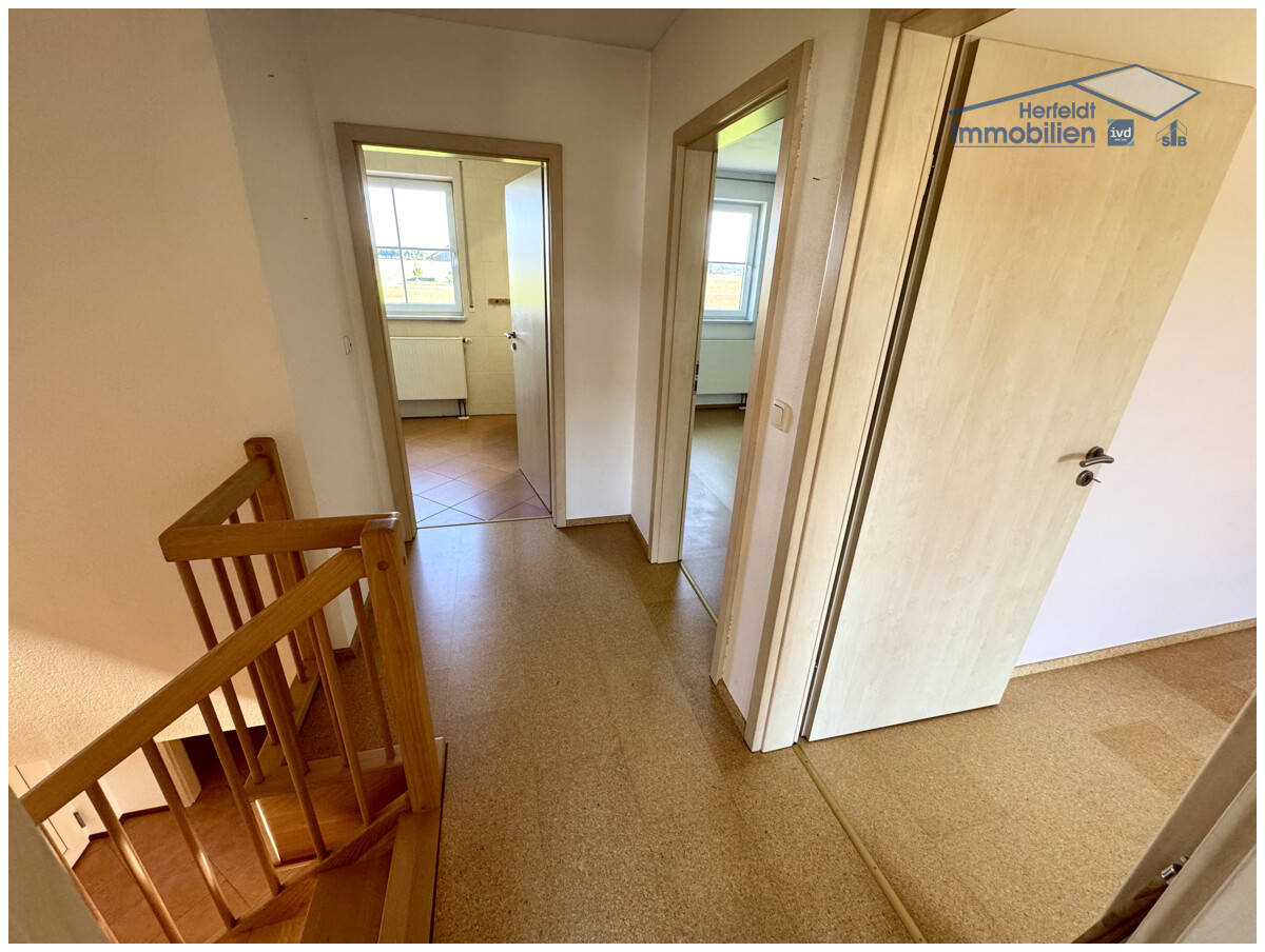 Über die stilvolle Vollholztreppe erreichen Sie das Obergeschoss, das mit drei harmonisch geschnittenen Schlafzimmern überzeugt – flexibel nutzbar etwa als Büro, Gäste- oder Ankleidezimmer. Ergänzt wird diese Ebene durch ein modernes, großzügiges Badezimmer mit Badewanne und separater Dusche, das Komfort und Eleganz perfekt vereint.