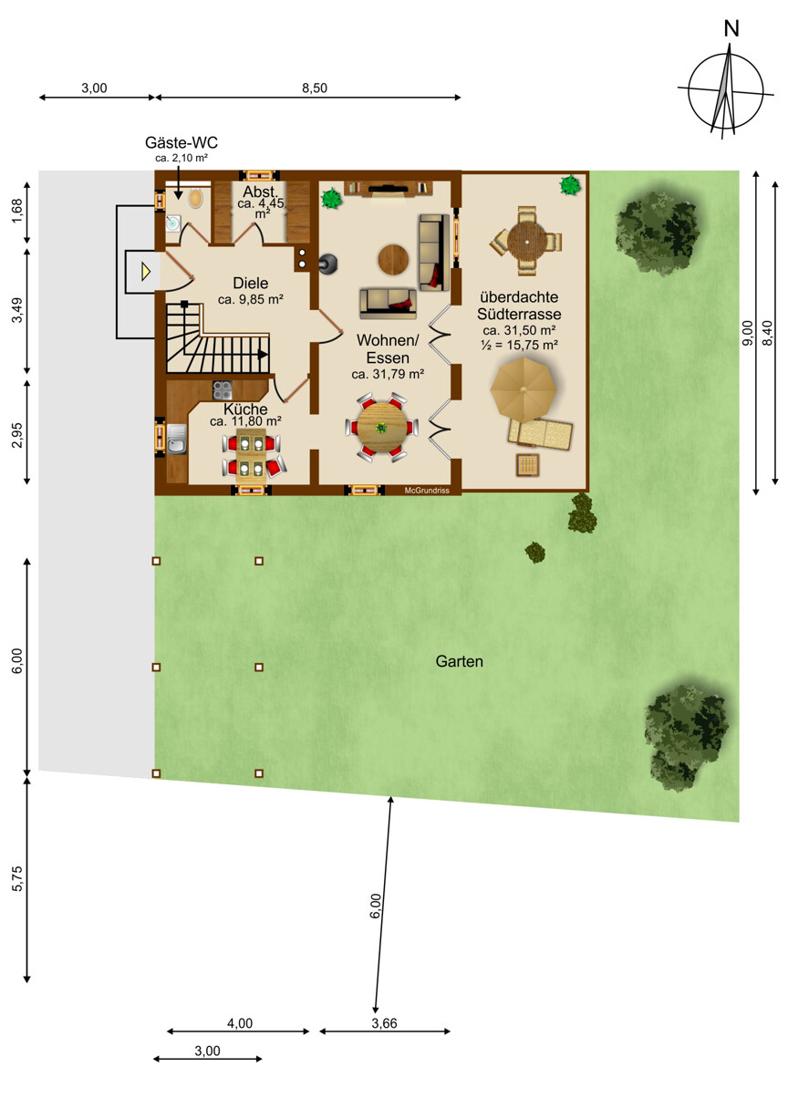 Dieses sehr gepflegte Einfamilienhaus aus dem Jahr 2006 überzeugt durch seine massive Ziegelbauweise, seine durchdachte Raumaufteilung und das insgesamt hochwertige, nahezu neuwertige Erscheinungsbild. Auf einem großzügigen Grundstück von ca. 614 m² bietet die Immobilie rund 125 m² Wohnfläche (inkl. anteiliger überdachter Terrasse) sowie zusätzliche ca. 59 m² Nutzfläche im Keller- und ca. 50 m² im Dachspeicher – insgesamt also beeindruckende ca. 234 m² Gesamtfläche.