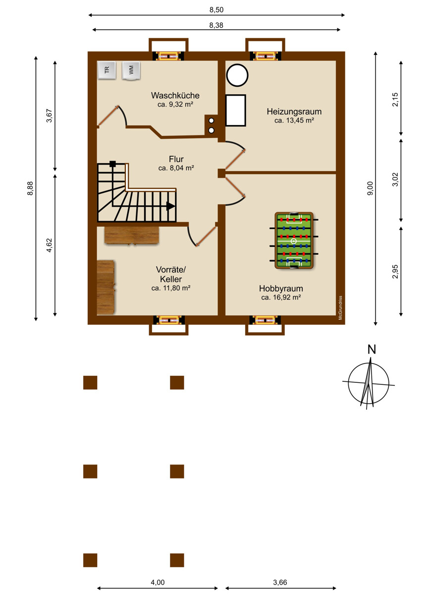Im Kellergeschoss stehen neben einem großen Hobbyraum auch eine Waschküche, ein Heizungsraum sowie ein Vorratsraum zur Verfügung.