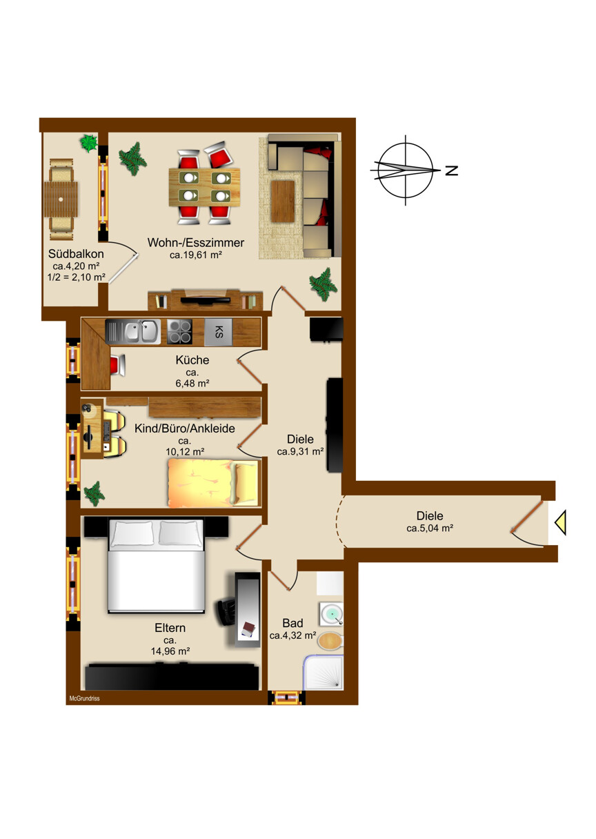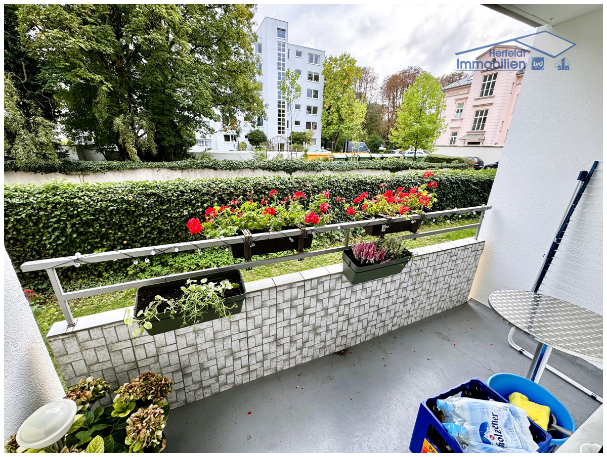 Das Herzstück der Wohnung bildet das großzügige Wohnzimmer mit direktem Zugang zum sonnigen Südbalkon. Von hier aus genießen Sie die Sonne vom späten Vormittag bis in die Abendstunden – perfekt für entspannte Lesestunden, ein Glas Wein zum Sonnenuntergang oder ein Frühstück im Freien, während der Blick über die gepflegten Grünflächen schweift.